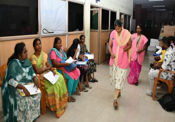 திருப்பூர், மாநகராட்சி அலுவலகத்தில் ஆரம்ப சுகாதார நிலையங்களில் காலியாக உள்ள பணியிடங்களுக்கு ஒப்பந்த அடிப்படையில் தற்காலிக பணியாளர்கள் தேர்வு நேர்காணலுக்கு வந்திருந்தவர்கள் .