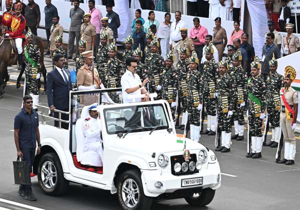 சுதந்திர தினத்தை யொட்டி சென்னை புனித ஜார்ஜ் கோட்டையில் நடந்த, சுதந்திரதின அணிவகுப்பு மரியாதை ஏற்றுக்கொண்ட முதல்வர் ஸ்டாலின்.