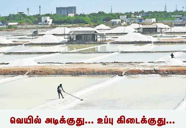 தூத்துக்குடி மற்றும் அதன் சுற்றுவட்டார பகுதிகளில் வெயிலின் தாக்கம் அதிகரித்து காணப்படுவதால், உப்பளங்களில் உப்பு உற்பத்தி பணிகள் ஜரூராக நடந்து வருகின்றன.