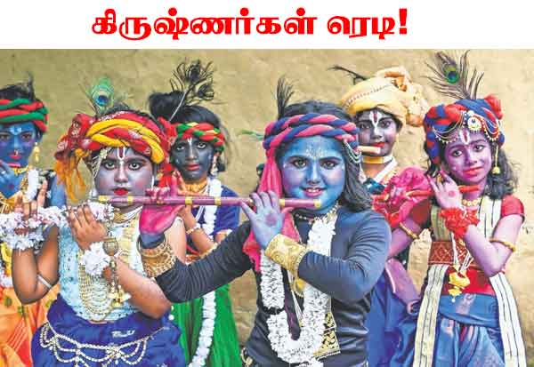 நாடு முழுவதும், கிருஷ்ண ஜெயந்தி இன்று கொண்டாடப்படுகிறது. இதற்கு கிருஷ்ணர் வேடமிட்டு தயாரான குழந்தைகள். இடம்: நாடியா, மேற்குவங்கம்