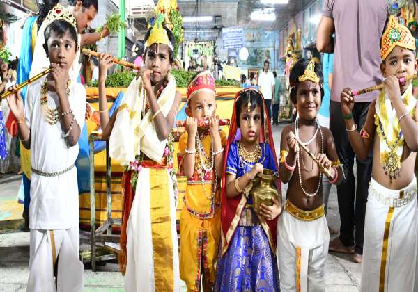 கிருஷ்ண ஜெயந்தியை முன்னிட்டு கிருஷ்ணர், ராதை வேடமணிந்து வந்த குழந்தைகள். இடம்: ஊத்துக்குளி ரோடு, திருப்பூர்