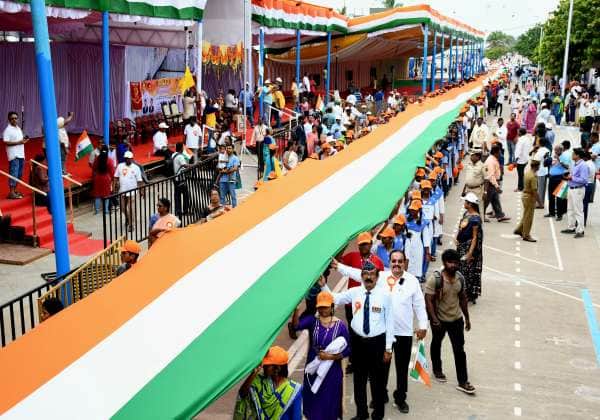 சுதந்திர தின விழாவை முன்னிட்டு, 3600 அடி நீளமுள்ள மூவண்ண கொடியை முன்னாள் முப்படை வீரர்கள் மற்றும் மாணவியர் ஏந்தி வந்தனர். இடம்: புதுச்சேரி