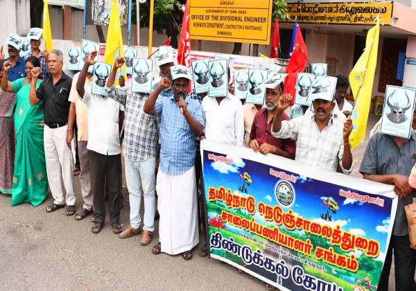 ஆர்ப்பாட்டம்:திண்டுக்கல்லில் தமிழ்நாடு நெடுஞ்சாலைத்துறை சாலைப்பணியாளர் சங்கம் சார்பில் முகமூடி அணிந்து ஆர்ப்பாட்டம் நடந்தது.