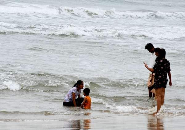 ஆபத்தான பகுதிகளில் அஜாக்கிரதையாக குளிக்கும் வெளிநாட்டு சுற்றுலாப்பயணிகள். இடம்: புதுச்சேரி கடற்கரை