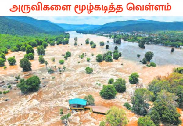 தர்மபுரி மாவட்டம், ஒகேனக்கல்லில் நீர்வரத்து அதிகரித்ததால் அங்குள்ள அருவிகளை எல்லாம் மூழ்கடித்து சென்ற தண்ணீர்.