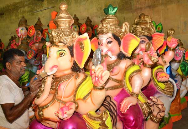 பிரமாண்ட விநாயகர் சிலைகளை வடிவமைக்கும் பணியில், ஈடுபட்டிருக்கும் பண்ருட்டியை சேர்ந்த கலைஞர்கள். இடம். திருவீதியம்மன் கோவில் தெரு, எர்ணாவூர்.
