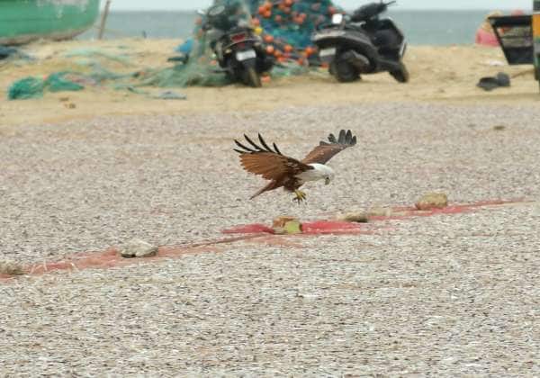 தூத்துக்குடி துறைமுக கடற்கரையில் மீனவர்களால் காயவைக்கப்பட்டுள்ள கருவாடுகளை தூக்கிச்செல்லும் பருந்து.