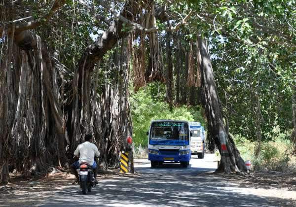 சாலை விரிவாக்கத்திற்காக பல இடங்களில் மரங்கள் வெட்டப்படும் நிலையில் தூத்துக்குடி மாவட்டம் ஏரல் - குரங்கணி சாலையில் பகுதியில் இயற்கை நுழைவாயிலாக அமைந்துள்ள ஆலமரம்.