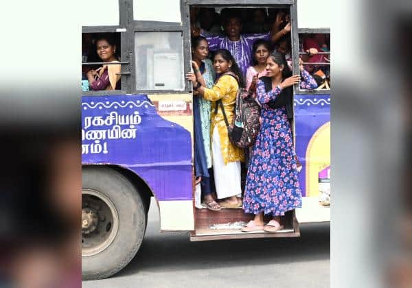மாணவர்களுக்கு இணையாக மாணவிகளும் சென்னை மாநகர பேருந்துகளில் படியில் தொங்கியபடி பயணம் மேற்கொள்கின்றனர். இடம்.சென்ட்ரல் அருகே, சென்னை