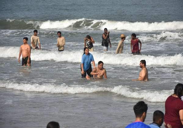 ஆபத்தை உணராமல் ஆனந்த குளியல் போடும் சுற்றுலாப்பயணிகள். இடம்: புதுச்சேரி.