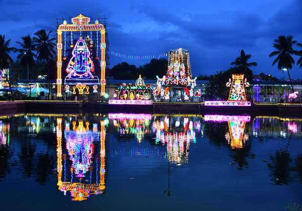 சிவகங்கை மாவட்டம் பிள்ளையார்பட்டி கற்பக விநாயகர் கோயிலில் சதுர்த்தி விழாவை முன்னிட்டு கோயில் மின்னொளியில் ஜொலித்தது