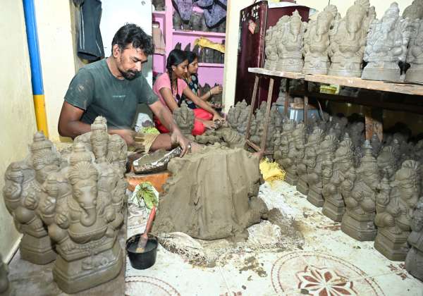 விநாயகர் சதுர்த்திக்கு இன்னும் சில தினங்களே உள்ள நிலையில் வீடுகளில் வைத்து வழிபடுவதற்காக களிமண் விநாயகர் சிலைகள் செய்யும்பணி நடைபெற்று வருகிறது. இடம்: ராயப்பேட்டை