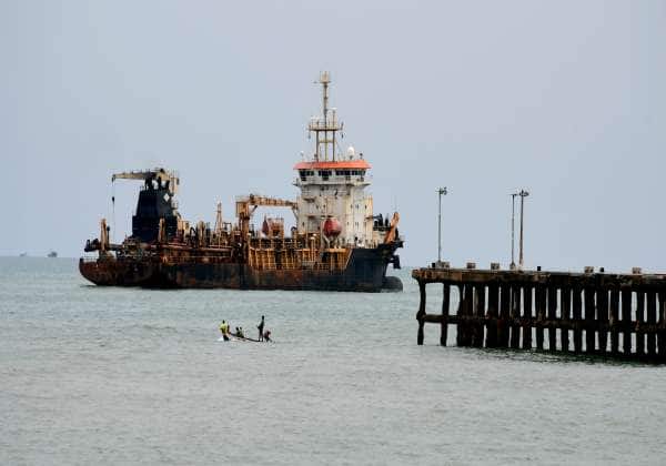 புதுச்சேரி பழைய துறைமுகத்தில் தூர்வாரும் பணியில் ஈடுபட்டுள்ள கப்பல்.