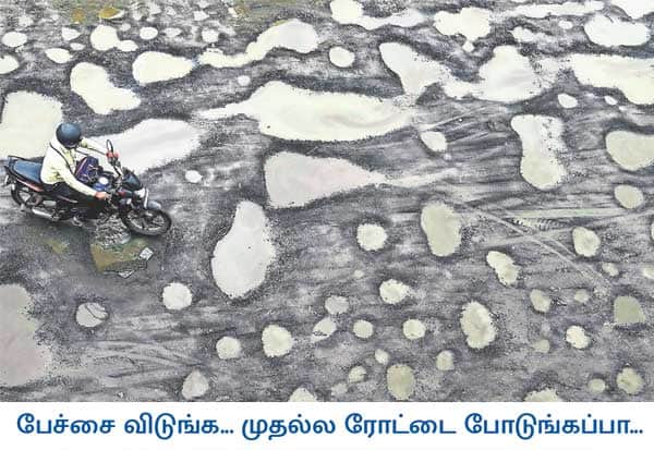 கொஞ்சம் மழை பெய்தாலே ரோடு மோசமாவது தேசிய பிரச்னை போலும், குஜராத் மாநிலம் ராஜ்கோட் நகரின் புறநகர் பகுதியில் மழை காரணமாக குண்டும், குழியுமான ரோட்டில் இருசக்கர வாகனத்தை ஓட்டிச் சென்ற நபர்.