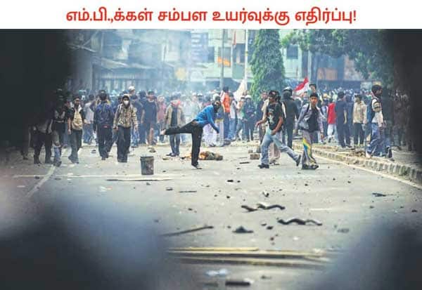 தென்கிழக்கு ஆசியாவில் மிகப்பெரும் பொருளாதார நாடாக இந்தோனேஷியா உள்ளது. அங்கு 575 எம்பிக்களுக்கான மாத சம்பவம் 10 கோடி ரூபாயாக உயர்த்தப்பட்டு உள்ளது. இதை கண்டித்து பார்லிமென்டை நோக்கி பேரணி சென்று போராட்டத்தில் ஈடுபட்ட மாணவர் அமைப்பினர். இடம்: ஜகார்த்தா, இந்தோனேஷியா.