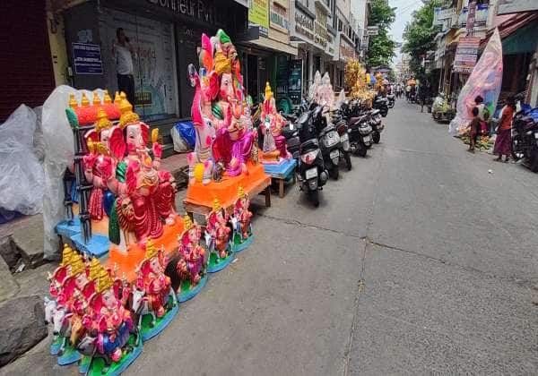 விநாயகர் சதுர்த்தி விழாவையொட்டி புதுச்சேரி அம்பலத்தடையார் வீதியில் விற்பனைக்கு வந்துள்ள விநாயகர் சிலைகள்.