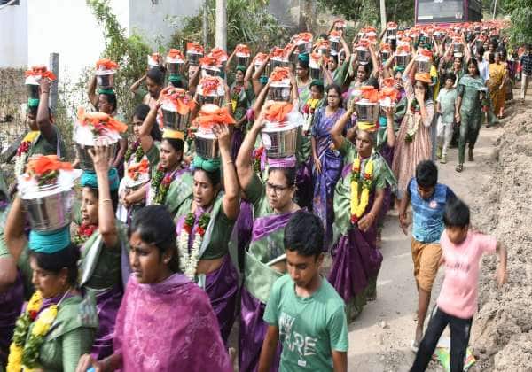திருப்பூர் வஞ்சிபாளையம் முருகம்பாளையம் மகாளியம்மன் கோவில் கும்பாபிஷேகத்தை ஒட்டி தீர்த்த குடம் எடுத்து வந்த பெண்கள்.