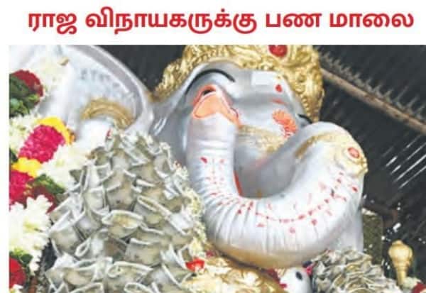 விநாயகர் சதுர்த்தியை முன்னிட்டு, ஹிந்து முன்னணி சார்பில், திருப்பூர், தட்டான் தோட்டம் பகுதியில் பிரதிஷ்டை செய்யப்பட்ட ராஜ விநாயகருக்கு, 500 ரூபாய் நோட்டுகளால் மாலை அணிவிக்கப்பட்டு இருந்தது.