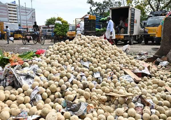 சென்னை கோயம்பேடு மார்க்கெட்டில் விற்பனையாகாத பழங்கள் முழுவதையும் குப்பையில் கொட்டியுள்ள வியாபாரிகள்.