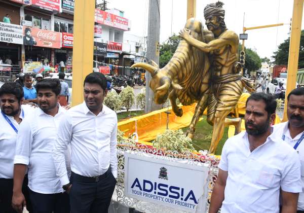 கோவை காளப்பட்டி ரவுண்டானாவில் ஜல்லிக்கட்டு காளை சிலையை திறந்து வைத்த அடிசியா டெவலப்பர்ஸ் நிறுவனர் மணிகண்டன்.