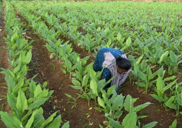 திருநெல்வேலி மாவட்டம் கீழநத்தம் பகுதியில் பயிரிடப்பட்டுள்ள மஞ்சள் செடிகளுக்கு நடுவே வளர்ந்துள்ள களைகளை எடுக்கும் பணி ஈடுபட்டுள்ள பெண்.