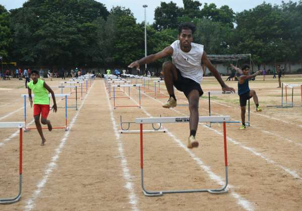 முதல்வர் கோப்பை விளையாட்டு போட்டியில் தடை தாண்டி ஓட்டப்பந்தயத்தில் கலந்து கொண்ட மாணவர்கள். இடம்: திருவள்ளூர்