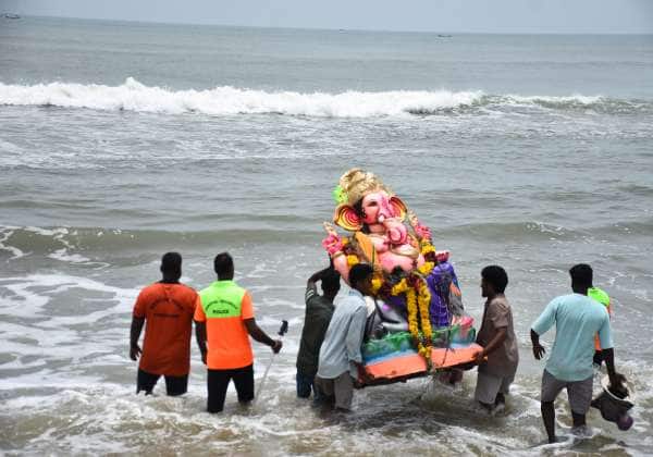கடலூர் தேவனாம்பட்டினம் சில்வர் பீச்சில், விநாயகர் சிலையை கடலில் கரைத்தனர்.