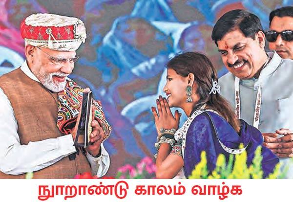 மத்திய பிரதேசம், தார் நகரில் நடந்த பல்வேறு அபிவிருத்தி பணிகளுக்கான அடிக்கல் நாட்டு விழாவில் பிரதமர் மோடி கலந்து கொண்டார். அப்போது பயனாளி ஒருவர் கூறிய பிறந்த நாள் வாழ்த்திற்கு புன்னகையால் நன்றி தெரிவித்தார். அருகில், அம்மாநில முதல்வர் மோகன் யாதவ்