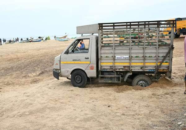 கடற்கரை மணல் பகுதியில் வாகனங்களை இயக்கக் கூடாது என உத்தரவு இருந்த போதிலும் தடையை மீறி வந்த சரக்கு ஆட்டோ சென்னை பட்டினப்பாக்கம் பகுதியில் மணலில் சிக்கியது.