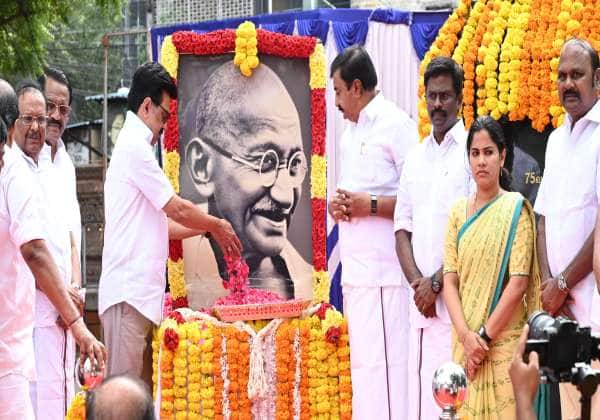 மகாத்மா காந்தியின் பிறந்தநாள் முன்னிட்டு சென்னை எழும்பூர் அரசு அருங்காட்சியக வளாகத்தில் உள்ள அவரது உருவ சிலைக்கு கீழ் வைக்கப்பட்ட படத்திற்கு முதல்வர் ஸ்டாலின் மலர் தூவி மரியாதை செலுத்தினார்.