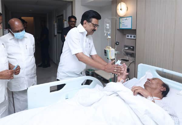சென்னை அப்பல்லோ மருத்துவமனையில் சிகிச்சை பெற்று வரும் பாமக நிறுவனர் ராமதாசை, முதல்வர் ஸ்டாலின் சந்தித்து உடல்லம் குறித்து விசாரித்தார்.
