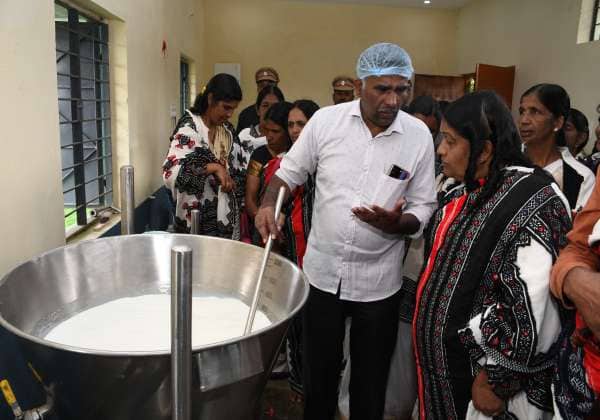 ஊட்டி சூட்டிங்மட்டம் பகுதியில், நெர்ஷ்ரோவ் தோடர் எருமை பால் மதிப்புக்கூட்டு மையத்தில், பன்னீர் தயாரிப்பதை பார்வையிடம் தோடரின பெண்கள்.
