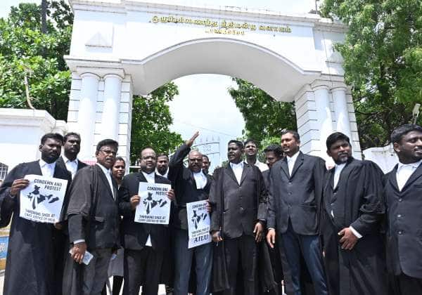 நீதிபதியை அவமதிப்பு செய்த சம்பவத்தை கண்டித்து புதுச்சேரி கோர்ட் முன்பு வக்கீல்கள் போராட்டத்தில் ஈடுபட்டனர்.