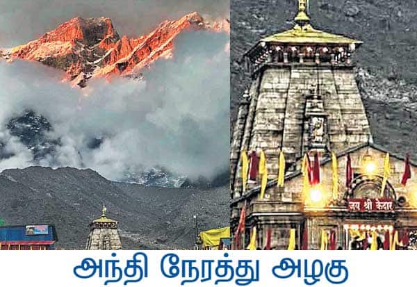 உத்தராகண்ட் மாநிலம் ருத்ரபிரயாக் பகுதியில் உள்ள கேதார்நாத் கோவிலுக்கு குடை பிடிப்பது போல தவிழ்ந்து வரும் மேகக்கூட்டம், பின்னால் மாலை நேர சூரியன் ஒளிபட்டு பொன்னிறத்தில் தகதகக்கும் இமயம்.