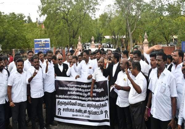 சென்னையில் பார் கவுன்சில் முன் வழக்கறிஞர் தாக்கப்பட்டதை கண்டித்து திருநெல்வேலி மாவட்டம் வழக்கறிஞர்கள் சார்பாக திருநெல்வேலி நீதிமன்றம் முன் கண்டன ஆர்ப்பாட்டம் நடந்தது.
