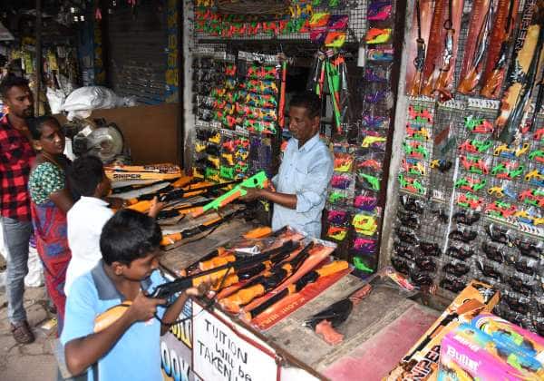 கடலூரில் தீபாவளி முன்னிட்டு சிறுவர்கள் ஆர்வத்துடன் துப்பாக்கியை தேர்வு செய்தனர். இடம்: கடலூர் மஞ்சக்குப்பம் நேதாஜி சாலை.