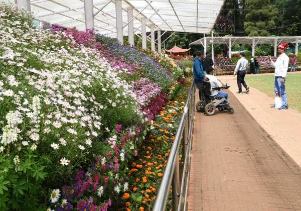 ஊட்டி தாவரவியல் பூங்காவில், காட்சிக்கு வைக்கப்பட்ட மலர்களை ரசித்து செல்லும் சுற்றுலா பயணிகள்.