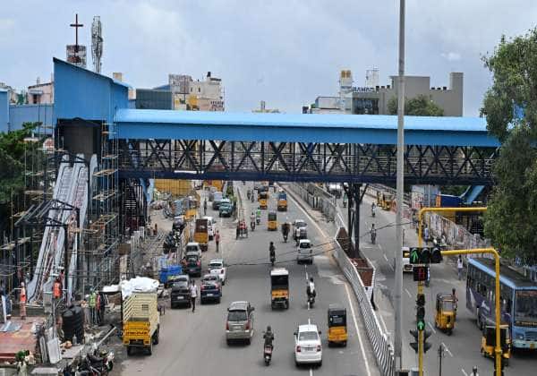 சென்னை பூந்தமல்லி நெடுஞ்சாலையில் எஸ்கலேட்டர் வசதியுடன் புதிதாக அமைக்கப்பட்டு வரும் நடை மேம்பாலப் பணிகள் இறுதி கட்டத்தை எட்டி உள்ளது. இடம்: அமைந்தகரை.