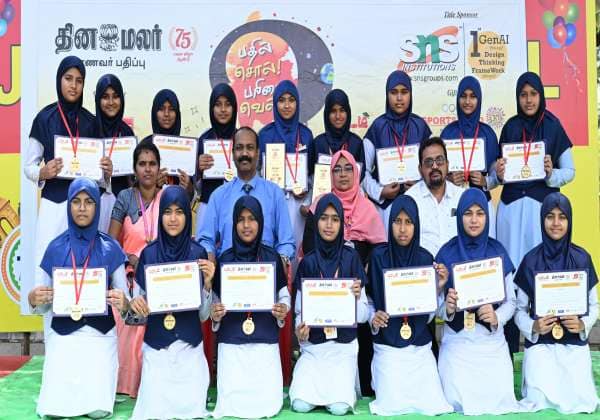 தினமலர் நாளிதழ் மாணவர் பதிப்பான பட்டம் இதழ் மற்றும் எஸ்.என்.எஸ்., கல்வி குழுமம் இணைந்து வழங்கும் பதில் சொல் - பரிசை வெல் வினாடி -வினா போட்டி கோவை கரும்புக்கடை ஜீவன்ஸ் பள்ளியில் நடந்தது. இதில் பரிசு பெற்ற மாணவர்களுடன் (இடமிருந்து) பள்ளியின் தமிழ் ஆசிரியை தயாளினி, முதல்வர் சிவக்குமரன், துணை முதல்வர் அஸ்மா பிர்தவுஸ், நிர்வாக அலுவலர் முகமது ரியாசுதீன் உள்ளிட்டோர்.
