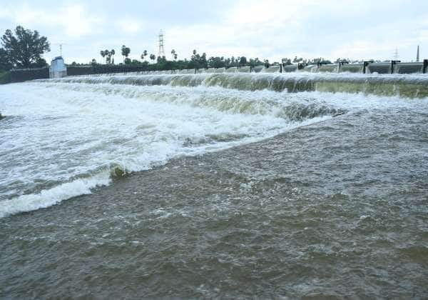 திருவள்ளூர் அடுத்த பூண்டி நீர் தேக்கம் நிரம்பியதால், திறக்கப்பட்ட உபரி நீர் தாமரைப்பாக்கம் அணைக்கட்டு வழியாக சீறிப்பாய்ந்து கடலுக்குச் செல்லும் காட்சி.