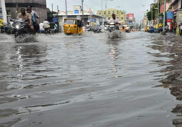 சென்னையில் பெய்து வரும் கனமழையால் மண்ணடி பிரகாசம் சாலையில் தேங்கி நிற்கும் மழை நீர்.