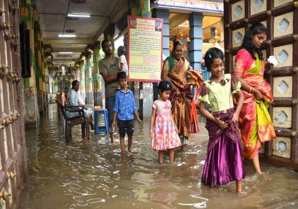 சென்னையில் பெய்து வரும் கனமழையால் பட்டாளம் ஆஞ்சநேயர் கோவில் உள்ளே தேங்கி நிற்கும் மழை நீர்.