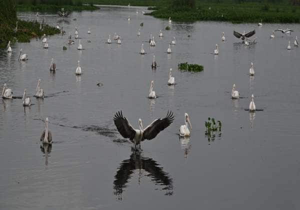 சென்னையில் காலை முதல் கொட்டித் தீர்த்த கன மழையால் இரை தேடி நூற்றுக்கணக்கில் சதுப்பு நிலத்தில் குவிந்துள்ள கூழைக்கிடா பறவைகள்.இடம் : பள்ளிக்கரணை
