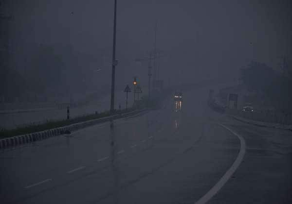 விருதுநகர் நான்கு வழிச்சாலையில் காலை 8 மணிக்கு சாரல் மழையுடன் பணி மூட்டம் காணப்பட்டது.