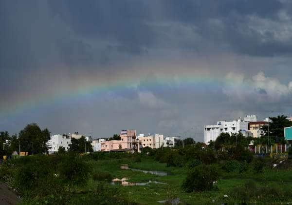 திருப்பூரில் தொடர் மழைக்கு இடையே சிறிது நேரம் சூரியன் உதிக்க வானவில் தெரிந்தது.