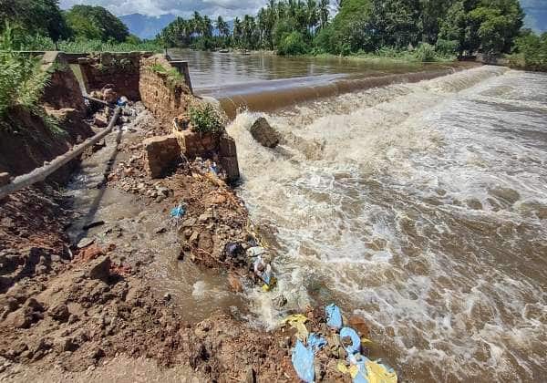 புதுச்சேரியில் பெய்த கனமழையால் கைக்கிலப்பட்டு சங்கராபரணி ஆறு படுகை அணை நிரம்பி வழிகிறது.