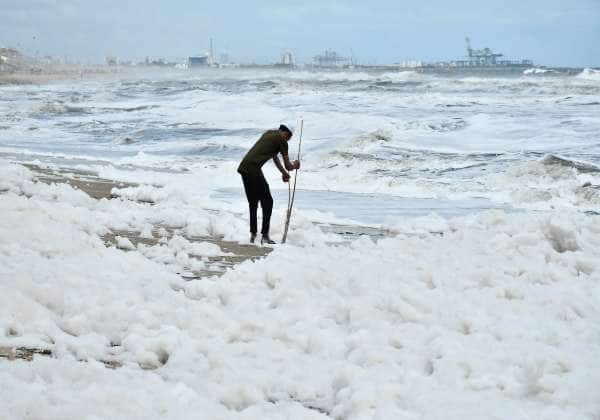 சென்னை மெரினா கடலில் வெள்ளை நுரை நிரம்பி அதிகமாக காணப்படுகிறது. இடம்: நொச்சிக்குப்பம்.