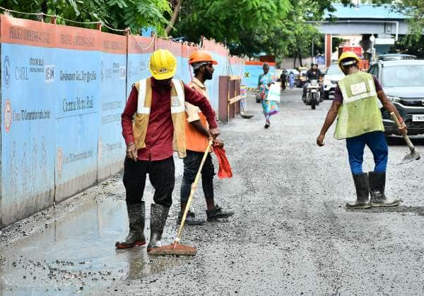 சென்னை தி.நகர் பகுதியில் மழையால் சேதமடைந்த சாலையை சரி செய்யும் பணியில் ஈடுபட்டுள்ள மெட்ரோ ஊழியர்கள்.