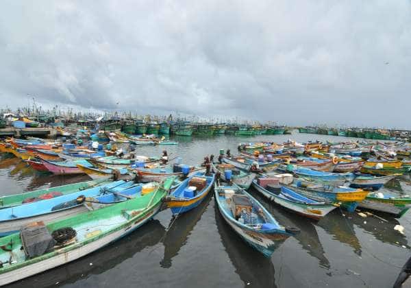 புயலின் காரணமாக சென்னை காசிமேடு மீன்பிடி துறைமுகத்தில் கரையில் நிறுத்தி வைக்கப்பட்டிருக்கும் படகுகள்.