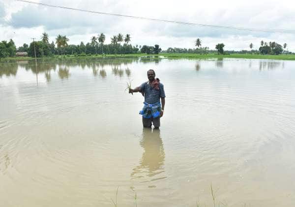 புதுச்சேரியில் பெய்த கனமழையால் கைக்கிலப்பட்டு கிராமத்தில் நெல் பயிர் மூழ்கியதை காண்பிக்கும் விவசாயிகள்.